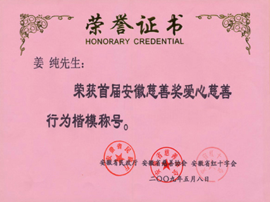 公司對愛心慈善事業的努力也得到了政府及社會的認可,公司曾被中華工商企業聯合會授予“抗震救災先進集體”,董事長姜純先生也曾被國家民政部授予“中華慈善獎---全國最具愛心行為楷模”、“中華慈善突出貢獻(個人)獎”、“安徽慈善獎---愛心慈善行為楷模”等榮譽稱號。