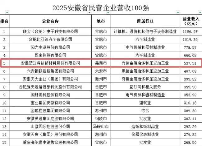 10月16日,2025安徽省民營企業(yè)百強(qiáng)發(fā)布會在合肥舉行。安徽楚江科技新材料股份有限公司憑借綜合實力榮登榜單,分別位列2025安徽省民營企業(yè)營收百強(qiáng)第5位和2025安徽省民營企業(yè)制造業(yè)百強(qiáng)第5名。