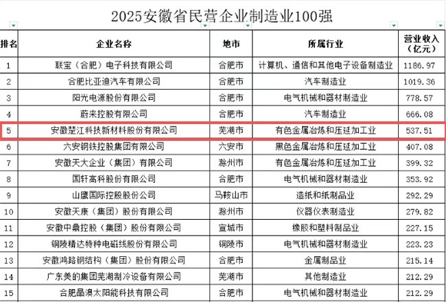 楚江新材上榜2025安徽省民營企業(yè)百強(qiáng)!